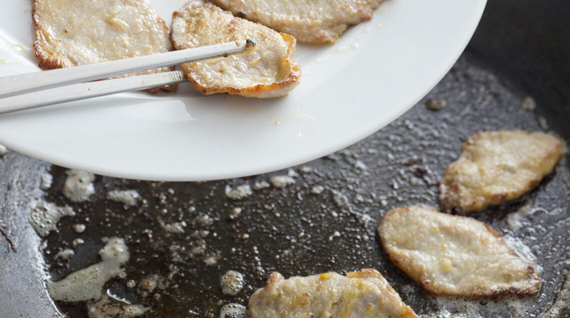 Pochi millimetri: per cuocere velocemente, le fettine adatte non devono superare circa 2-3 millimetri di spessore. Se sono più alte, si appiattiscono con un batticarne, dopo averle chiuse tra due fogli di carta da forno o pellicola (foto in basso) così da evitare di lacerarle durante l’operazione.