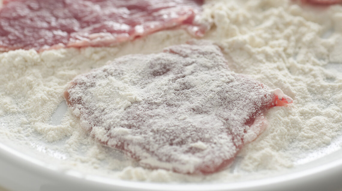 La leggera infarinatura delle fettine (foto in basso) ha due scopi: il primo è permettere di dorare rapidamente la carne, il secondo di addensare i succhi e ottenere un intingolo ben legato. Sempre prevista in caso di cotture in bianco, come nelle classiche scaloppine al limone o al vino bianco, a volte si omette in quelle al pomodoro, come la pizzaiola, naturalmente più dense e “sugose”.