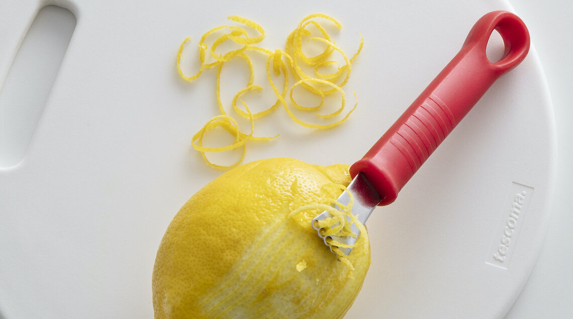 Le zeste (in francese) o zest (in inglese) altro non sono che filettini sottili perfetti come guarnizione. Si ricavano con l’attrezzino chiamato rigalimoni (foto in basso) o con le grattugie a fori larghi. A volte le zeste si devono candire, ovvero cuocere in uno sciroppo di zucchero che le addolcisce e le rende traslucide: in questo caso devono essere un po’ più spesse e larghe e si possono ottenere riducendo strisce larghe a julienne, con un coltellino affilato.
