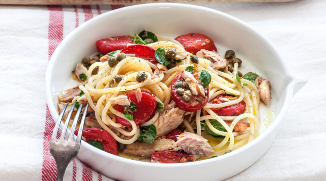 La ricetta degli spaghetti con confit di datterini (foto in alto) è appena più lunga nella preparazione, per via della cottura in forno dei pomodorini. Ma si possono usare quelli semisecchi e realizzare, con due ottimi prodotti da dispensa, un grande primo piatto!