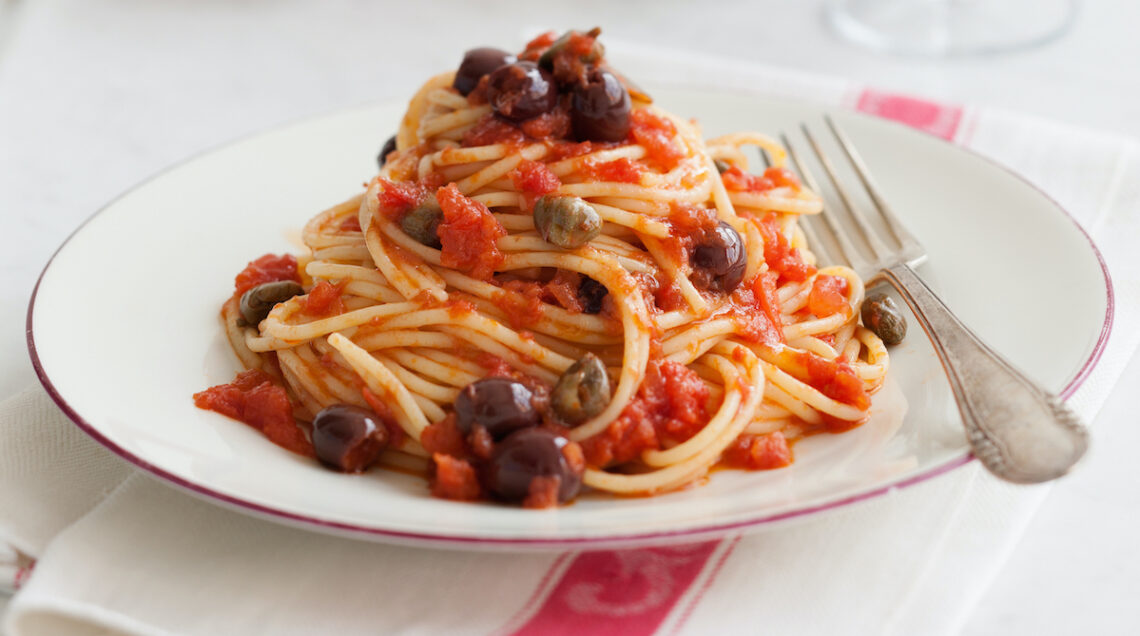 Come si diceva, gli spaghetti di diametro medio sono quelli che meglio si adattano ai mille condimenti della cucina tradizionale come alle ricette più creative. Sposano le vongole come la puttanesca (foto in basso), l’intramontabile aglio, olio e peperoncino e i sughi a base di ortaggi (zucchine, piselli, peperoni, e così via, in bianco o in rosso).