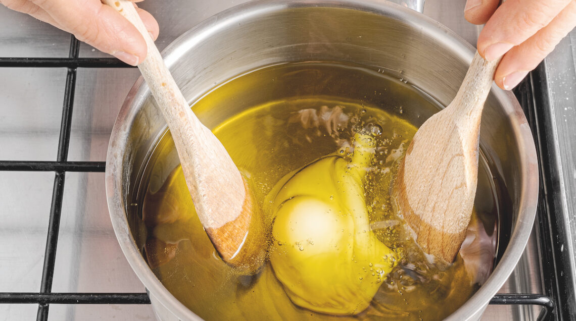 Deep fried. È la versione fritta dell’uovo in camicia. Non si esegue propriamente in padella ma la facciamo rientrare fra queste preparazioni perché, come detto, è previsto l’utilizzo di un condimento: l’olio extravergine d’oliva(preferibile, perché più saporito, a quello di semi). Scaldatene 2 cm in una piccola casseruola, a fuoco medio. Sgusciate un uovo in un mestolo e versatelo delicatamente nell’olio. Rivoltate subito l’albume sul tuorlo, girando l’uovo con due cucchiai di legno. Cuocete ancora per 30-60 secondi finché l’albume è rappreso (ma il tuorlo sarà ancora morbido). Prelevate l’uovo con un mestolo forato e sgocciolatelo su carta per fritti.