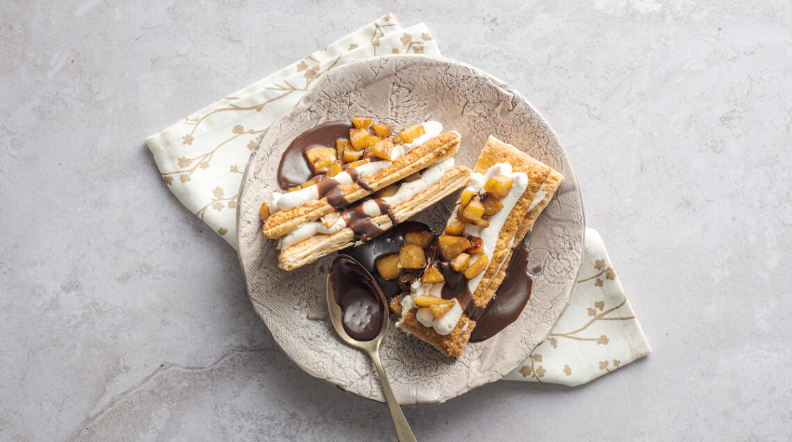 Le note intense del cacao amaro trovano nella componente zuccherina del miele il perfetto comprimario: è il caso della salsa che irrora la millefoglie con pere e ricotta (foto in alto).