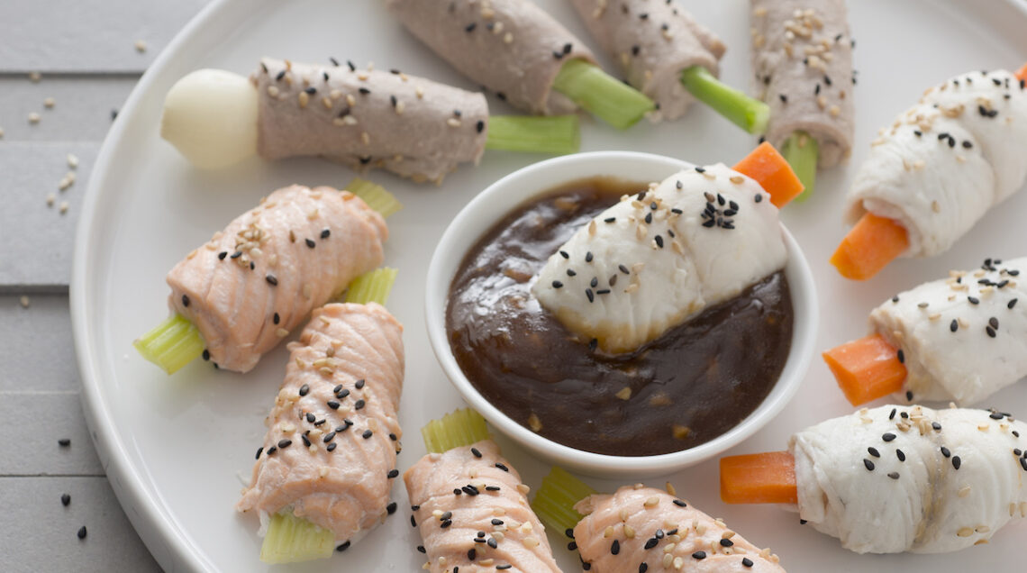 Di ispirazione asiatica, con salsa di soia, zenzero, olio e semi di sesamo, è il dip al miele in cui intingere i rotolini di carpaccio di salmone, tonno e spada (foto in alto) appena scottati a vapore. Un piatto semplice da realizzare, ma ricercato dei gusti, che quel tocco di miele rende ancora più intrigante.