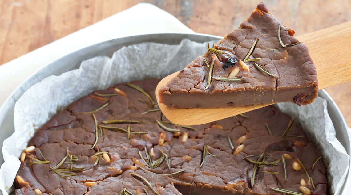 Castagnaccio con pinoli e uvetta. Mettete ammollo 40 g di uvetta. Versate in una ciotola capiente 250 g di farina di castagne. Unite un pizzico di sale, 3 cucchiai di olio e, poco alla volta, 3 dl circa di acqua tiepida, versandola al centro e mescolando man mano con una frusta: se necessario, unite ancora un po’ d’acqua, quanto basta per ottenere una pastella densa. Continuate a lavorarla con la frusta in modo da eliminare tutti i grumi. Foderate una teglia di 24 cm di diametro di carta da forno, bagnata e strizzata, e spennellate d’olio fondo e bordo. Versate il composto, distribuitevi sopra 30 g di pinoli e l’uvetta scolata. Cospargete con gli aghi di 2-3 rametti di rosmarino e infornate 180° per 45-50 minuti. Per 6 persone.