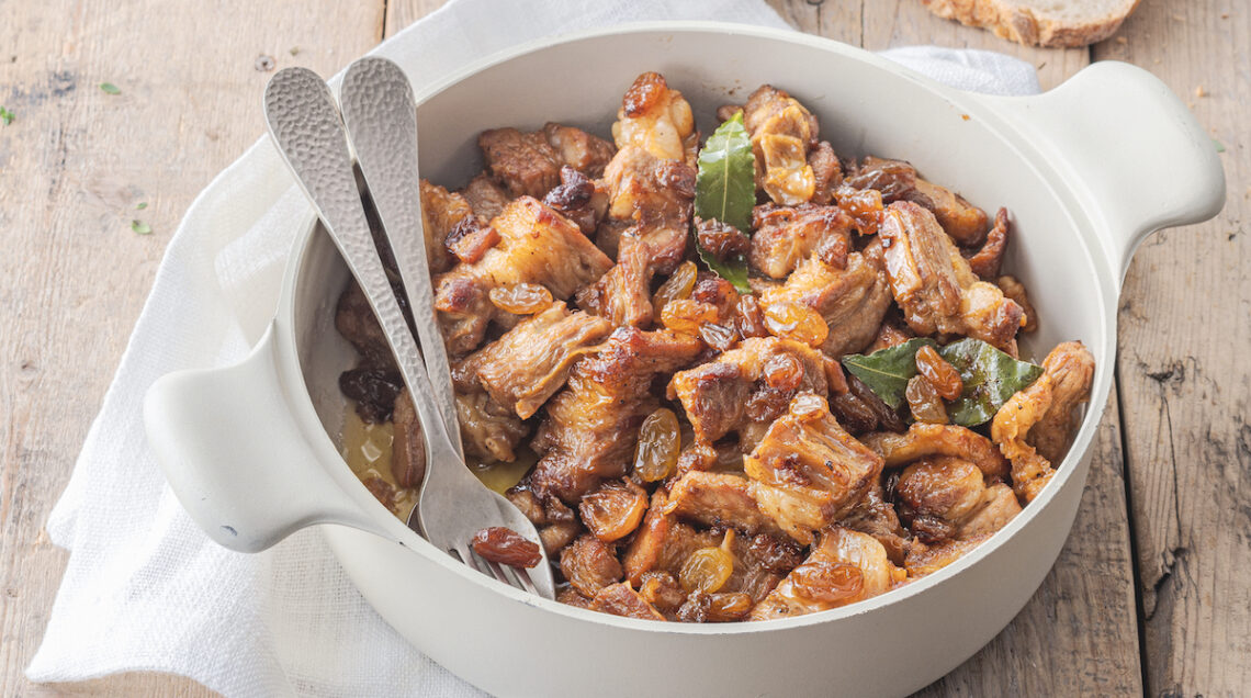 Spezzatino confit alle uvette bionde. Sbucciate 2 spicchi d’aglio e tritateli finemente. Tagliate a pezzi 1,2 chili di teneroni di vitello. Trasferiteli in una casseruola che possa andare in forno. Aggiungete 120 g di uvetta bionda (tipo cilena), l’aglio tritato e 5 foglie di alloro. Bagnate con il succo di un’arancia, aggiungete 5 dl di vino bianco, sale, pepe e infornate a 180° per un’ora e 30 minuti, mescolando e girando di tanto la carne per cuocerla in modo uniforme. Per 6 persone.