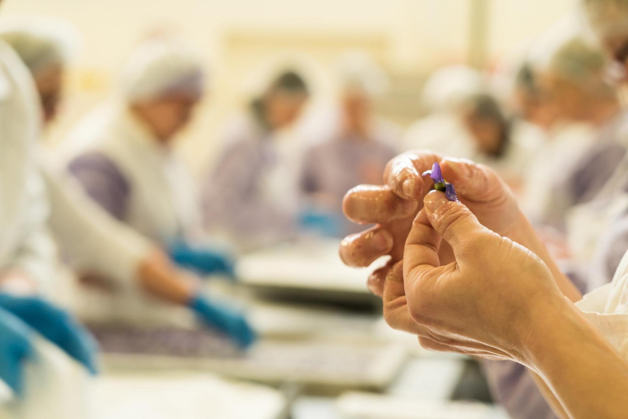 Una tra le (poche) aziende che coltiva ancora questo rito, che si compie una volta all’anno, èAgrimontana, a Borgo S. Dalmazzo, che infatti si definisce un marchio capace di “imprigionare la primavera”. Il procedimento di produzione e lavorazione segue una serie di passaggi tutt’altro che semplici. La prima cosa della quale bisogna tener conto nella produzione delle violette candite è il tempo. Ogni anno la data di produzione cambia in funzione dello sbocciare delle violette: i fiori infatti, per essere lavorati e non danneggiati, devono essere abbastanza grandi. Le violette appena recise arrivano in Agrimontana la sera e sono raccolte in mazzetti, vengono vaporizzate con acqua e lasciate riposare per essere lavorate la mattina successiva. Questo procedimento ne garantisce la freschezza e mantiene il colore dei fiori brillante. I fiori vengono uno ad uno privati manualmente del gambo e successivamente i petali vengono pennellati con le dita uno a uno con sciroppo di glucosio prima di essere fatti saltare con molta attenzione nello zucchero semolato.