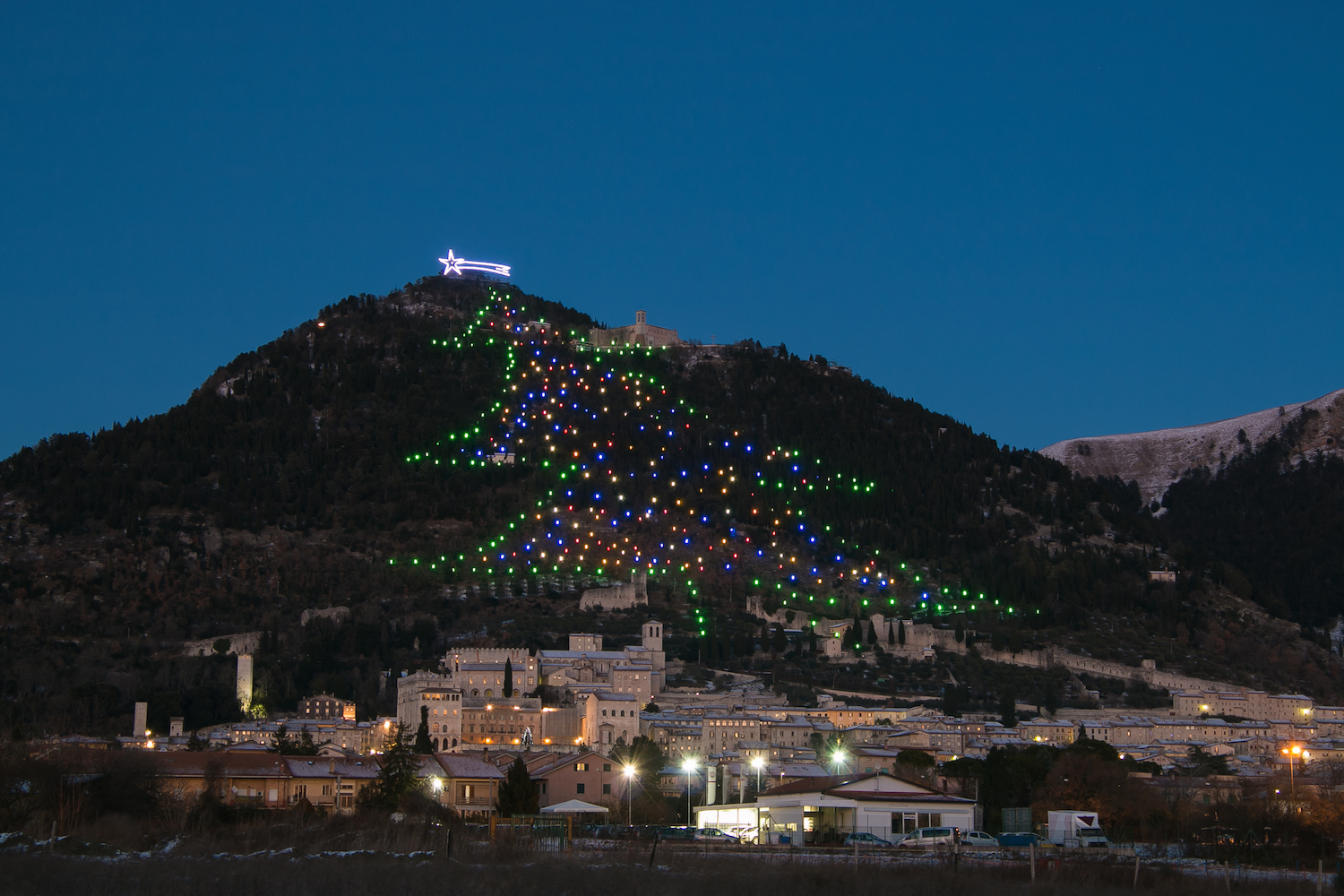 Dal 1981, primo anno della sua realizzazione, è un enorme albero di Natale il simbolo del Natale di Gubbio, nel cuore dell’Umbria. Si tratta di un albero da record, il più grande del mondo, realizzato con luci che per oltre 750 metri illuminano le pendici del Monte Ingino alle spalle della città medioevale. Uno spettacolo colorato da ammirare anche dai mercatini cittadini nei giardini di Piazza 40 Martiri, animati dai tanti stand in legno in cui trovare idee per lo shopping natalizio. E se volete godere di un panorama unico su Gubbio (e non soffrite di vertigini!) è d’obbligo un giro sulla ruota panoramica.