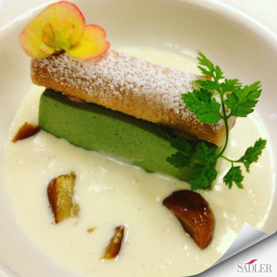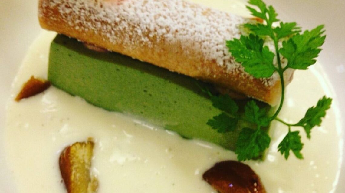 Tra i piatti forti del menù creativo c'è la Zuppa alla vaniglia con mousse di the verde Matcha, cannoncini ripieni di castagna e melograno