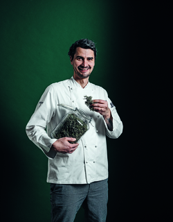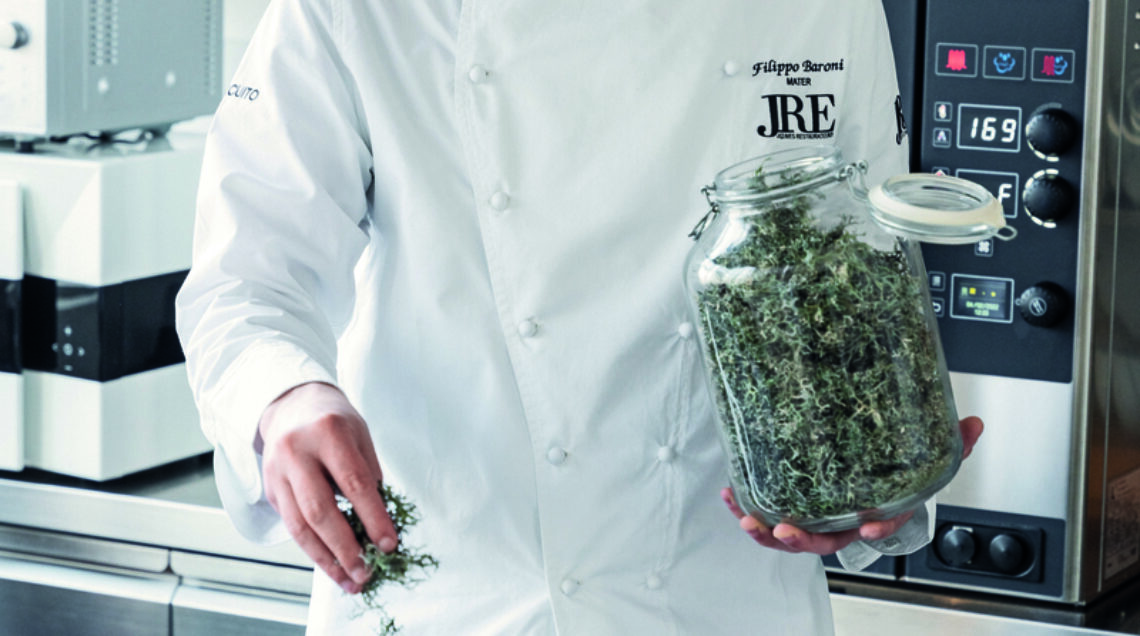 E così nel 2017 con la moglie Marta Bidi apre accanto alla struttura ricettiva de I tre Baroni il ristorante Mater, previo stage di "affinamento" con Gaetano Trovato (2 stelle Michelin). La proposta è interessante, prende spunto dalla fitoalimurgia, la nutrizione d'emergenza a base di erbe spontanee, fiori, bacche e tuberi, per giocare di contrasti tra ingredienti poveri e veraci e garbate evocazioni luxury, come il cuore spruzzato di caviale della ricetta che vi proponiamo.