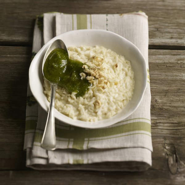 Tritate finemente uno scalogno e fatene appassire metà in una casseruola con un filo d’olio. Aggiungete 320 g di riso Arborio e tostatelo 1-2 minuti. Sfumate con mezzo bicchiere di vino bianco, fate evaporare l'alcol e portate a cottura il risotto bagnandolo, poco alla volta, con circa 1,2 litri di brodo vegetale bollente. Nel frattempo, tritate un ciuffo di prezzemolo e frullate le foglie nel mixer con lo scalogno tritato rimasto, 50 g di gherigli di noce, 30 g di pecorino grattugiato (facoltativo, per una versione vegan potete ometterlo) e 4-5 cucchiai di olio. Togliete il risotto dal fuoco, unite 30 g di parmigiano reggiano grattugiato (anche questo, facoltativo), aggiungete un filo d’olio, mescolate bene e fate riposare coperto per 2 minuti. Regolate di sale e servite il risotto nei piatti guarnendo con il pesto e, a piacere, alcuni gherigli di noce spezzettati. Per 4 persone.