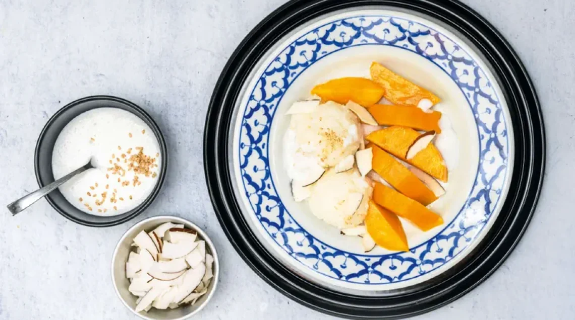 Mango e riso glutinoso, piatto della cucina thai noto come khao niao mamuang, è una pietanza che si trova nelle bancarelle e nei ristoranti di tutto il paese. Il dolce può essere trovato in vari paesi del sud-est asiatico, ma è particolarmente associato alla Thailandia e al Laos. L'origine precisa del piatto non è chiara, ma sembra che mango e riso appiccicoso venivano consumati già nel Siam del XIV secolo. Per questo è ormai un piatto naturalizzato thai, ed è considerato un tradizionale dessert a base di riso e latte di cocco, guarnito con mango fresco. La sua caratteristica principale, da cui deriva anche il nome, è la consistenza appiccicosa del riso che viene prima messo in ammollo per perdere l’amido e poi cotto a vapore.