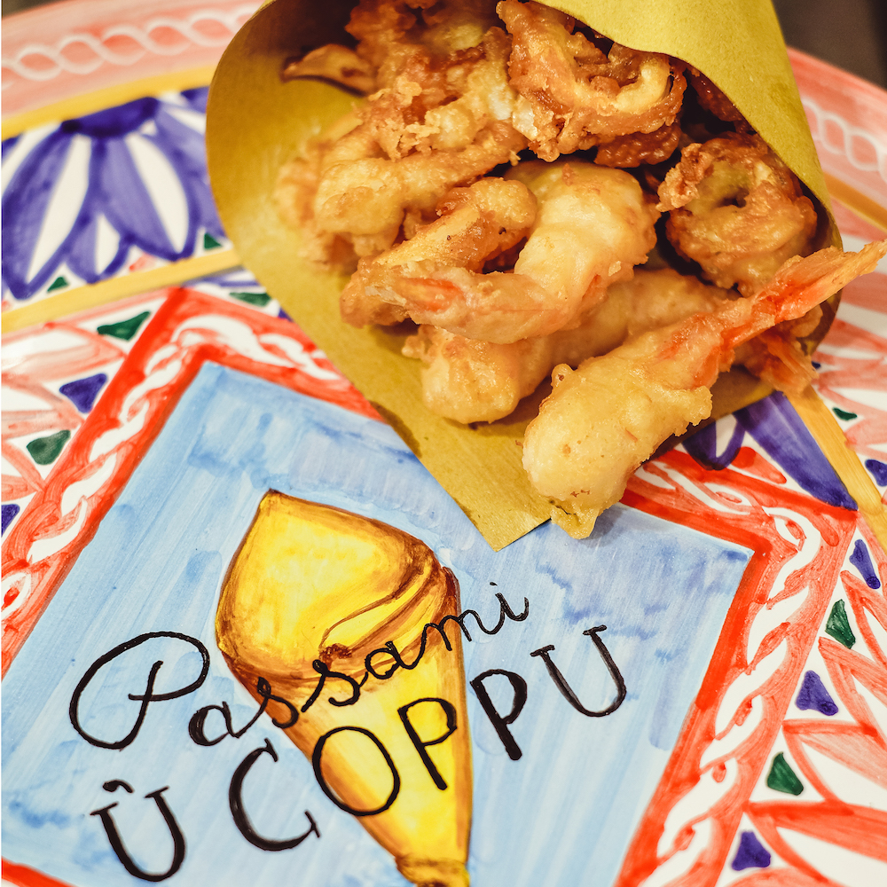 I coppi di carta vengono riempiti al momento con specialità fritte nella cucina a vista: arancine alla carne ma anche più innovative con sarde e finocchietto, rascatura di panelle e crocchette, panzerotti, verdure in pastella, sfincionello alla palermitana. La scelta è ampia e comprende anche un menù di street food dolce con cannoli, cassatelle e iris con ricotta, ossia piccole brioche ripiene di crema di ricotta dolce con gocce di cioccolato.