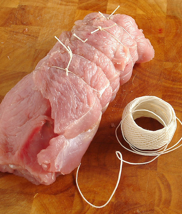 È un passaggio indispensabile per poterlo tenere in forma durante la cottura (foto sopra) e ottenere un taglio dalle fette perfetto. Se non l’avete acquistato già legato, a questo punto vi servirà uno spago da cucina, resistente e che non perda fibre o frammenti, un tagliere e un coltello ben affilato.