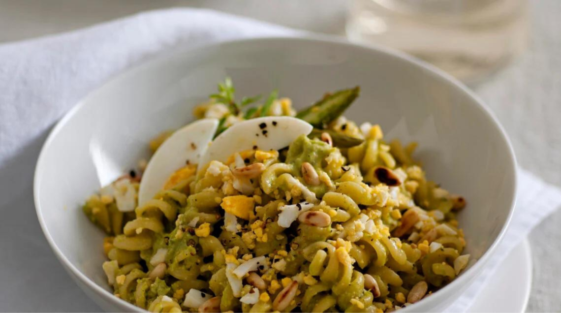 In questa ricetta il pesto di asparagi si sposa benissimo con il trito di uova sode creando un primo piatto tanto originale quanto saporito e invitante.