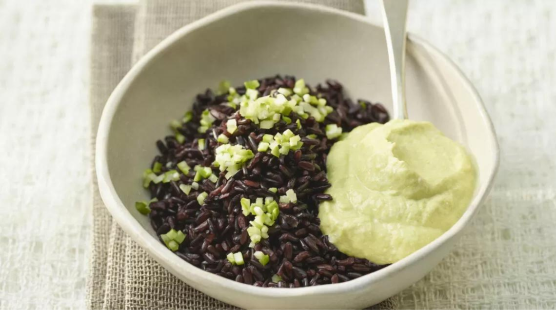Una dadolata verde decora un primo piatto vegetariano a base di riso. Il valore aggiunto è la mousse di asparagi impreziosita da ricotta forte.