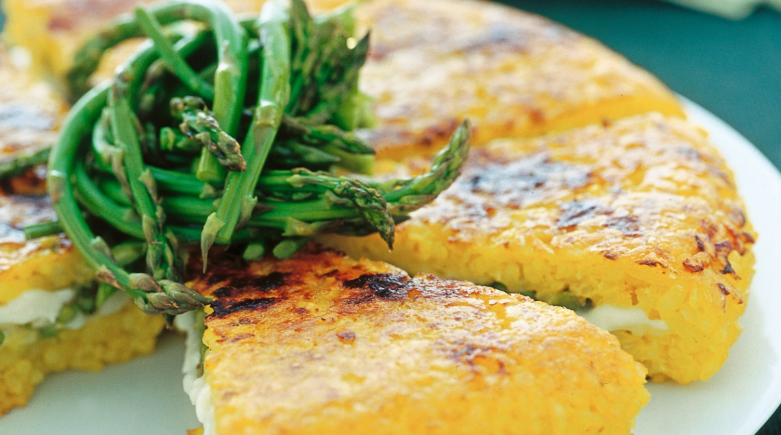 L'elegante aroma dello zafferano rende ancora più gustosa questa variante del riso al salto milanese arricchito dagli asparagi.