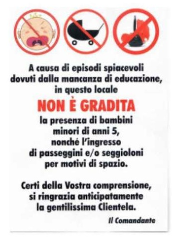 Michela Maria Bernardini Il locale in questione è una osteria romana non propriamente di classe. Il gestore nell'intervista dice chiaramente che ce l'ha con i genitori che si siedono e se ne fregano di quello che fanno i figli, è vero ci sono bambini che nei ristoranti corrono e urlano, come è vero che esistono adulti che ti gridano, bestemmiano ecc. e ti rendono "partecipe" delle loro conversazioni mentre tu vorresti mangiare tranquillamente seduta al tavolo accanto, il cartello andrebbe messo verso i maleducati in generale, di qualsiasi età, non verso i bambini, visto che esistono anche quelli che sanno stare a tavola, magari colorando e disegnando con i fogli e colori che la mamma (o il ristoratore!) ha portato.