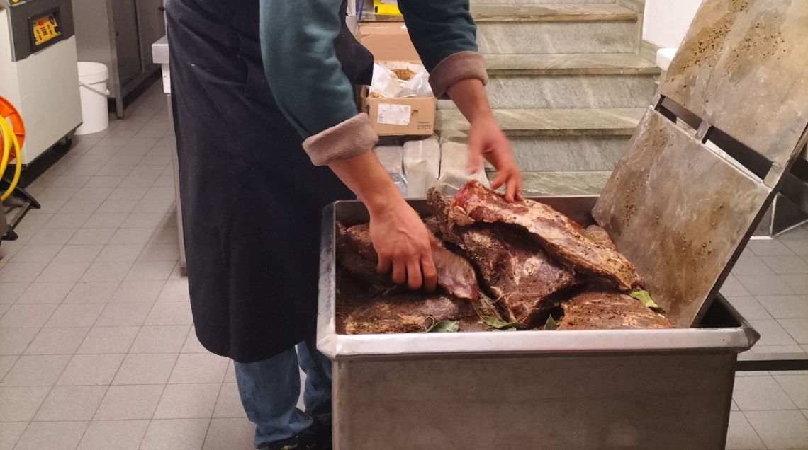Ma vi sono altri aspetti che fanno della brisaola un salume a sé stante. Per scoprirle bisogna attraversare piazza Rodolfo Pestalozzi, con al centro il caratteristico obelisco, e il ponte sulla Mera, protetto dalla severa statua di San Giovanni Nepomuceno. Un’altra macelleria che risale a fine Ottocento, un tempio della gastronomia dai profili semplici e sobri, è il regno di Tommaso Panatti, giovane macellaio-salumiere che ha ereditato il lavoro e la passione di famiglia. “Dopo che dalla coscia del manzo ho ottenuto 4 parti, noce, magatello, fesa e sottofesa, le deposito all’interno di contenitori appositi detti marne con sale, pepe e alloro”. Le diverse parti rimangono per un periodo variabile tra una settimana e dieci giorni nei contenitori, in base alla dimensione. Una volta tolte, vengono lavate e appese per la stagionatura, che può durare dai 40 ai 60 giorni, sempre in base alla dimensione. “Alcune di esse, dopo il lavaggio, vengono leggermente affumicate per poche ore, secondo la tradizione chiavennasca, grazie alla lenta combustione di legno di faggio. Dipende dalla richiesta del mercato”. Intanto Tommaso scende in un antro all’interno della macelleria per recuperare una speciale brisaola, particolarmente marezzata, gustosissima e morbida. “Ma nessuno la acquisterebbe…” afferma con coraggio.