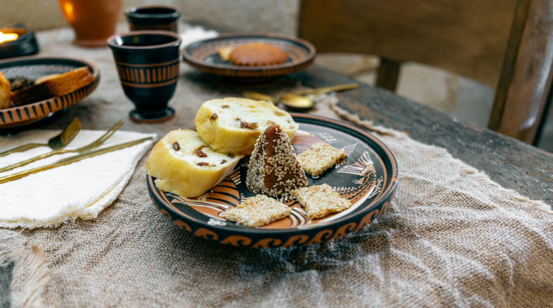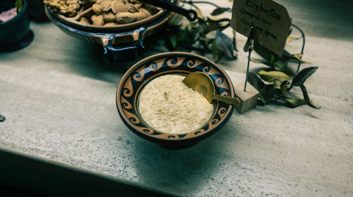 Qui il primo gesto del mattino, l’akrátisma, viene reinterpretato con una colazione rituale che riscopre ingredienti e sapori documentati dalle fonti storiche (ad esempio grazie agli studi su testi classici e reperti archeologici), portando in tavola focacce aromatiche, dolci con ricotta, formaggi di capra, uova di quaglia e creme come quella di ceci, il tutto accompagnato da contesti sensoriali che richiamano pratiche antiche.