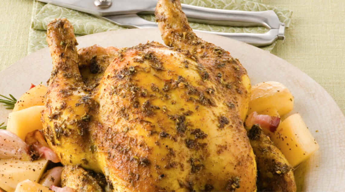 Curcuma, peperoncino, cannella, cumino ed erbe aromatiche regalano alla ricetta di quest'arrosto alle spezie con patate un profumo intenso e stuzzicante.