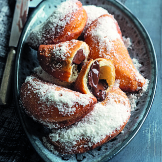 Fondete 430 g di cioccolato fondente insieme a 220 g di cioccolato al latte in scaglie, mescolando ogni 30 secondi con un cucchiaio di metallo. Mettere da parte a raffreddare per 10 minuti; versate 250 g di cocco in scagliette in un piatto fondo.
