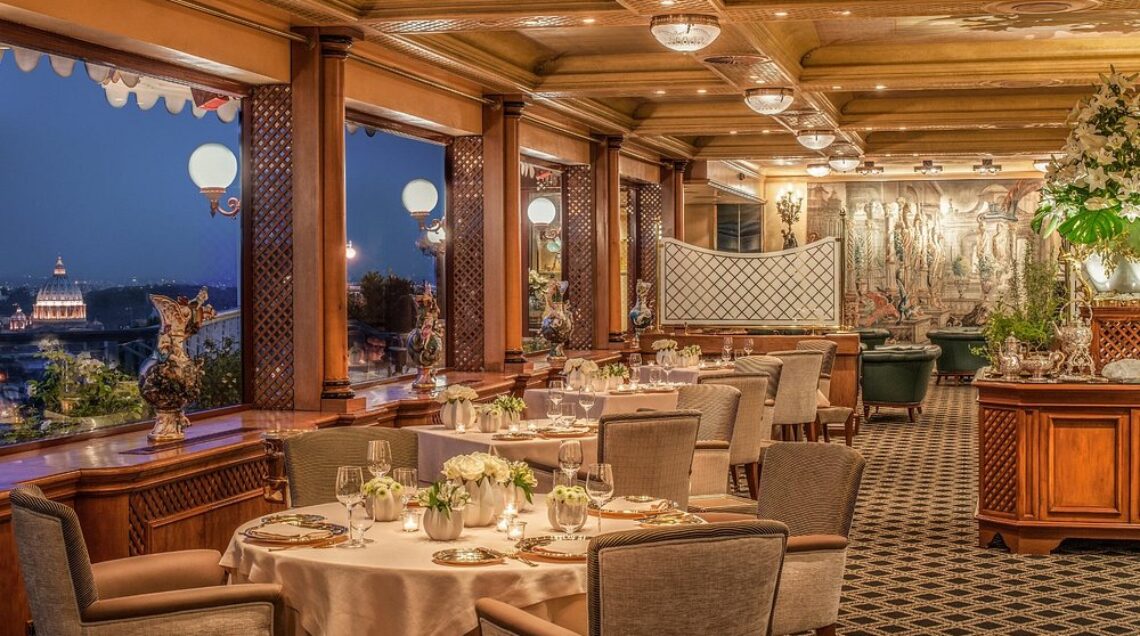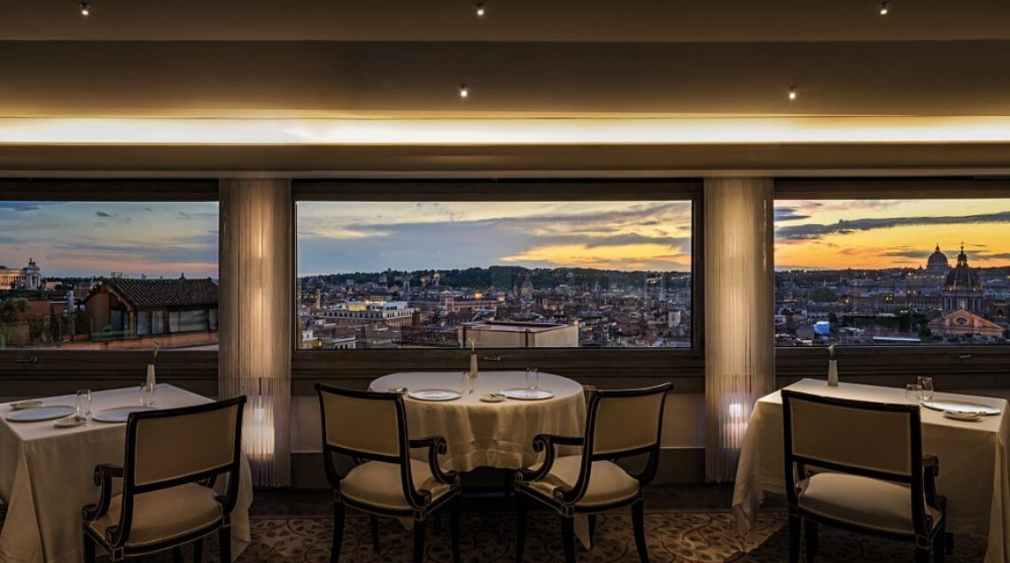 Il ristorante, una stella Michelin, al sesto piano dell’hotel ha una vista panoramica su Roma con una sala che ospita dodici tavoli esclusivi. Ristorante storicissimo, meta del jet set internazionale, ma con una nuova mano creativa: la proposta fine dining di chef Andrea Antonini unisce piatti e sapori locali a piatti dal respiro internazionale, per una nuova reinterpretazione, in stile gourmet, della cucina romana. E non di meno è la cantina con 1500 etichette selezionate. Piatti che raccontano di Roma e dell’Italia ma sanno anche di mondo.