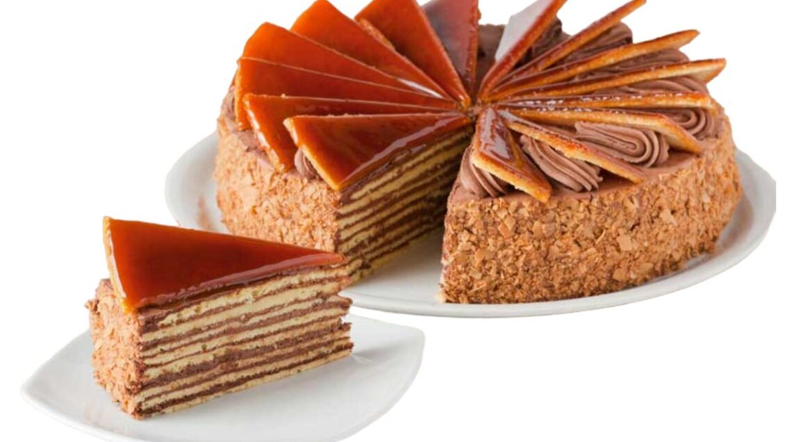 Questa torta fu creata nel 1885 dal celebre pasticcere József Dobos, che la presentò all'Esposizione Universale di Budapest. Il suo obiettivo era quello di realizzare un dolce che durasse più a lungo senza perdere freschezza, grazie all’uso innovativo della crema al burro, che all’epoca non era ancora comune in pasticceria. Ancora oggi pasticcerie come Cukrászda Auguszt la preparano seguendo la ricetta originale. È uno dei dolci più raffinati della pasticceria ungherese, famosa per i suoi strati sottili di pan di Spagna alternati con crema al burro al cioccolato e una decorazione unica: una copertura di caramello croccante che le dona un aspetto elegante e un gusto irresistibile. La Torta Dobos è composta da sei o più strati di pan di Spagna leggero, farciti con una ricca crema a base di cioccolato e burro, che la rende morbida e golosa. La particolarità che la distingue è la sua copertura di caramello lucido, versato sull’ultimo strato e tagliato a spicchi, che aggiunge una nota croccante e un aspetto scenografico. Ancora oggi, la torta è un simbolo della pasticceria ungherese e viene preparata nei migliori caffè e pasticcerie di Budapest.
