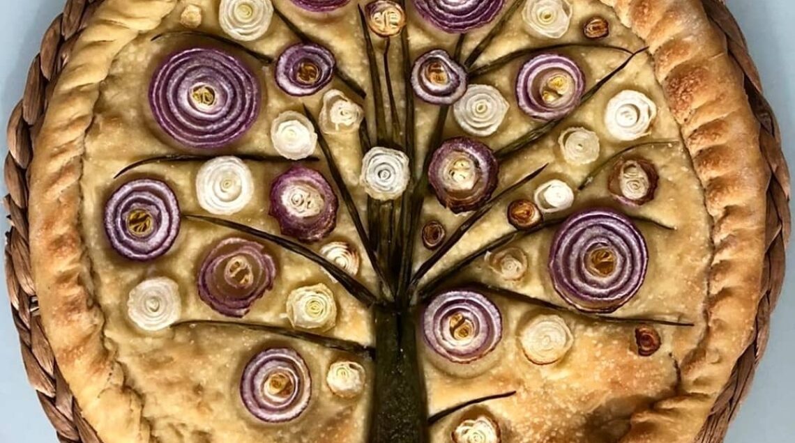 Il disegno dell'albero della vita trasforma una semplice focaccia alle cipolle in creazione artistica.