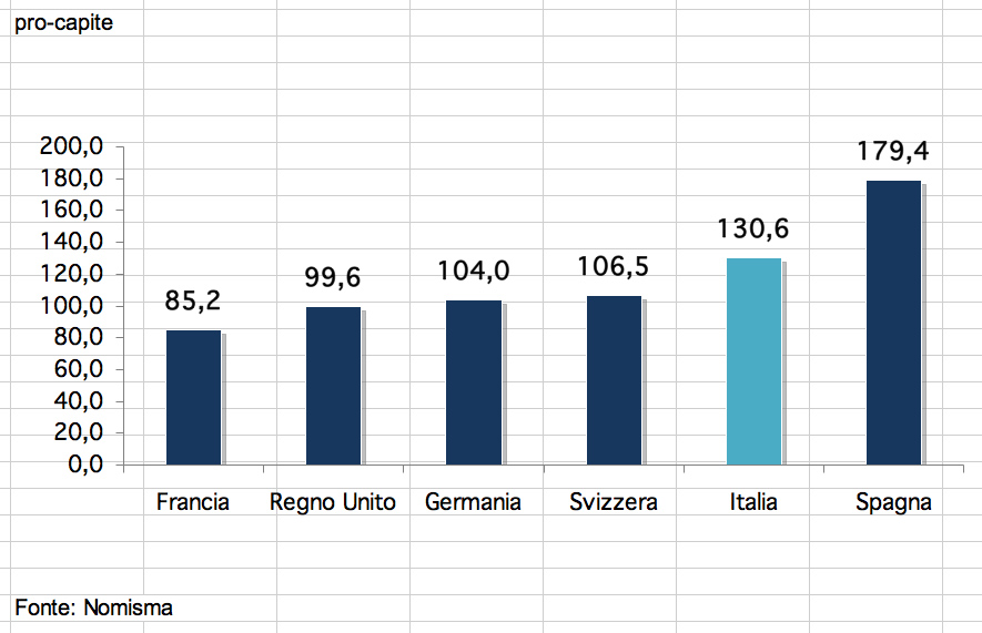 Secondo la fotografia relativa al 2014, scattata da Nomisma, l'Italia risulta essere il fanalino di coda, insieme alla Svizzera, rispetto al resto d'Europa. A oggi, tra i Paesi europei, solo la Spagna segnala un consumo pro capite di 490 grammi al giorno - in perfetta linea con le direttive OMS -, la Francia si ferma a 223 grammi, il Regno Unito a 273, mentre la Germania si distingue per una timida ripresa.
