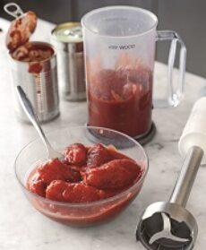In una grande padella, meglio di ferro ma anche antiaderente, versate a freddo l'olio, i peperoncini, l'aglio sbucciato e i pelati frullati