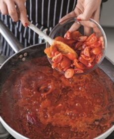 Accendete e il fuoco e, quando il sugo sobbolle, aggiungete i pomodorini e un pizzico di sale.