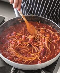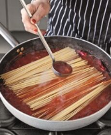 Fate cuocere con il coperchio per 15 minuti circa, poi aggiungete gli spaghetti crudi. Aiutandovi con un mestolo ricoprite la pasta con il sugo.