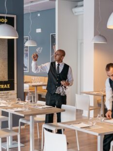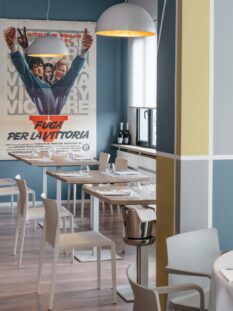 Superato il cancello del carcere, sulla sinistra del cortile si vede l’insegna del ristorante. La sala è piacevolissima, ben arredata, soprattutto luminosa. C’è proprio una bella luce, le sbarre non si notano neanche. Ad accoglierci ci sono Ivan Manzo, il monolitico chef, e Massimo Sestito, il maître, che ricorda tanto (ma tanto) Claudio Amendola. Loro sono uomini liberi, amici dai tempi della scuola alberghiera e sono responsabili, oltre che dello staff di detenuti, anche di un’atmosfera goliardica che ci mette subito o nostro agio.
