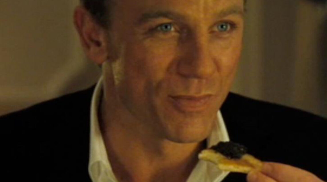 Il cinema non poteva esimersi dal celebrare il prezioso oro nero del Caspio anche nelle sue pellicole: è noto che un personaggio dai noti gusti raffinati, James Bond, voleva solo il più esclusivo e costoso dei caviali, il Beluga. Bond lo menzionerà in diversi film, tra cui Thunderball-Operazione Tuono (servito rigorosamente con champagne Dom Pérignon), Al servizio segreto di Sua Maestà, Bersaglio Mobile e Casino Royale (foto sotto) e – in Golden Eye e Il mondo non basta – specificherà che il miglior beluga è quello prodotto da un ex agente del Kgb, Valentin Dmitrovich Zukovsky.