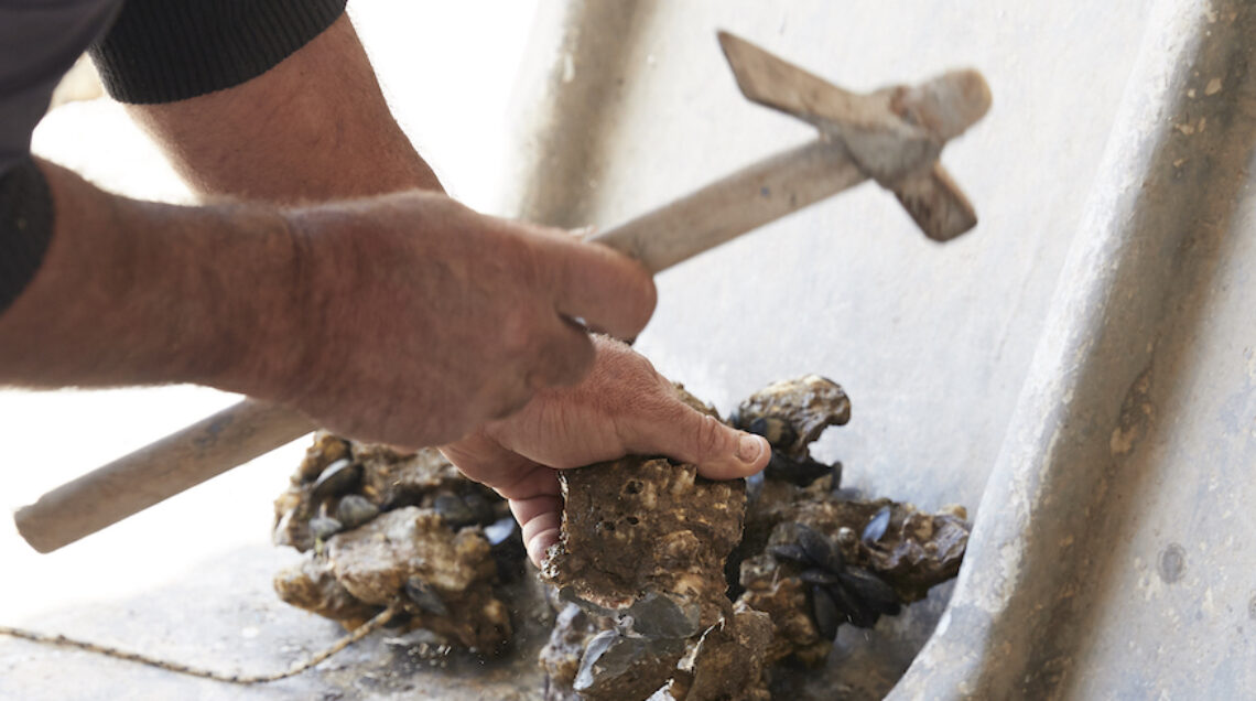 Quando le ostriche su corde sono pronte per la raccolta, le cime vengono staccate dai pali e i blocchi di cemento spaccati a colpi di martello e piccozze per estrarre le conchiglie. Si ottengono così le varietà più pregiate, “intitolate” a San Michele e nate dalla collaborazione tra Falco e un altro allevatore, Alessandro Tamburrano.