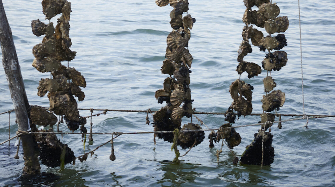 L’allevamento su corde è il più particolare. Una volta “mature”, le ostriche sono attaccate a blocchi di cemento, a loro volta fissati su lunghe corde. Le cime, con il loro carico di molluschi, sono fissate a pali di legno e immerse nell’acqua.