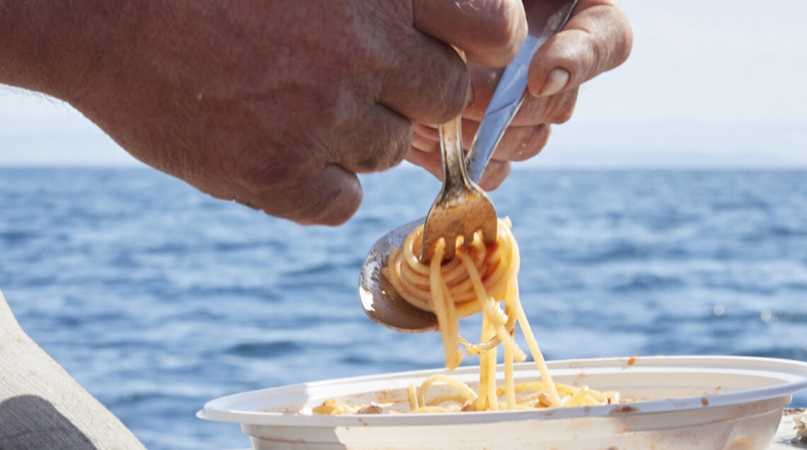 Ma torniamo in mare. Mentre si avvicina l’ora di pranzo, si attiva la cambusa di bordo. L’acqua della pasta è pronta per essere messa sul fuoco: non senza aver assicurato bene le pentole per evitare che si rovescino con il rollio della barca!