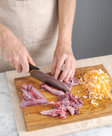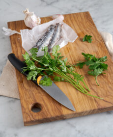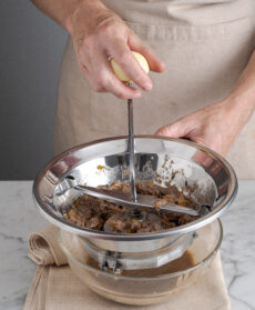 Lavate e asciugate 3 acciughe sotto sale, poi tritatele con 1 spicchio d'aglio e abbondante prezzemolo. Impastate il mix con 120 g di soppressa sbriciolata.