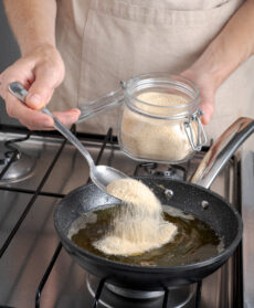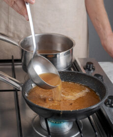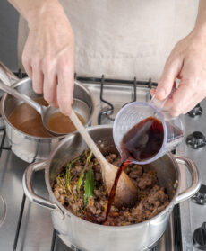 Unite 2 cucchiai di aceto e 1 di farina e cuocete per 5 minuti. Aggiungete 75 ml di vino rosso, 300 ml di brodo di carne, 300 ml di acqua e 2 bacche di ginepro e cuocete per 45 minuti.