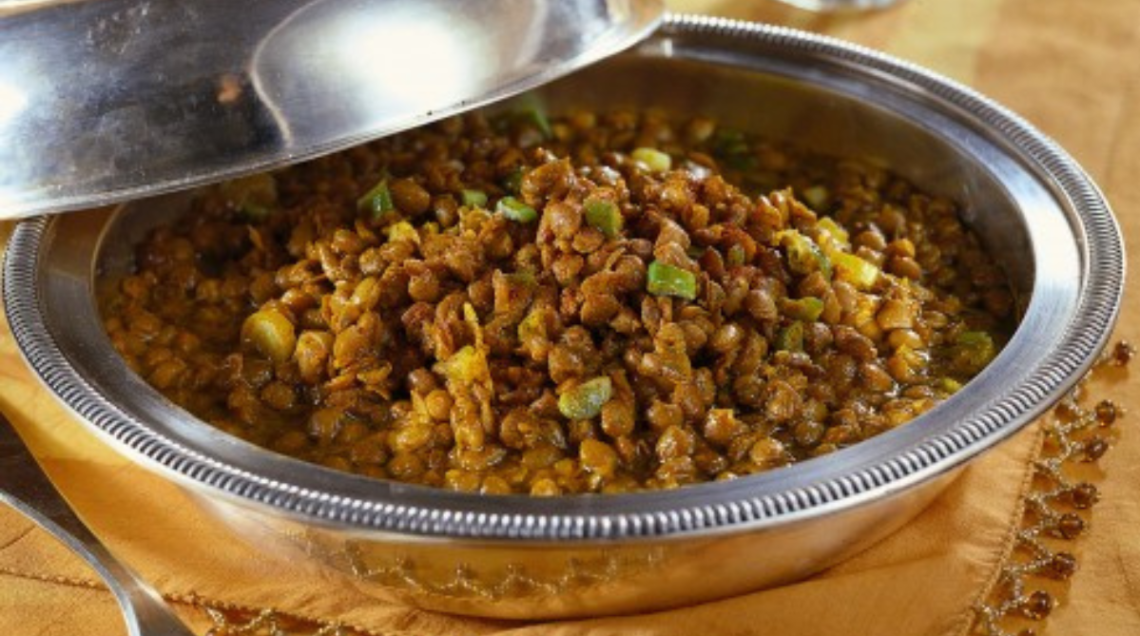 Un piatto unico vegetariano a base di lenticchie accompagnato con una fresca salsa allo yogurt e zafferano