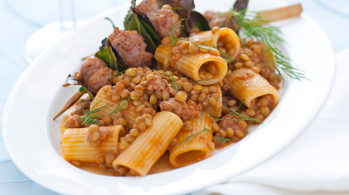 Rigatoni con spiedini di salsiccia