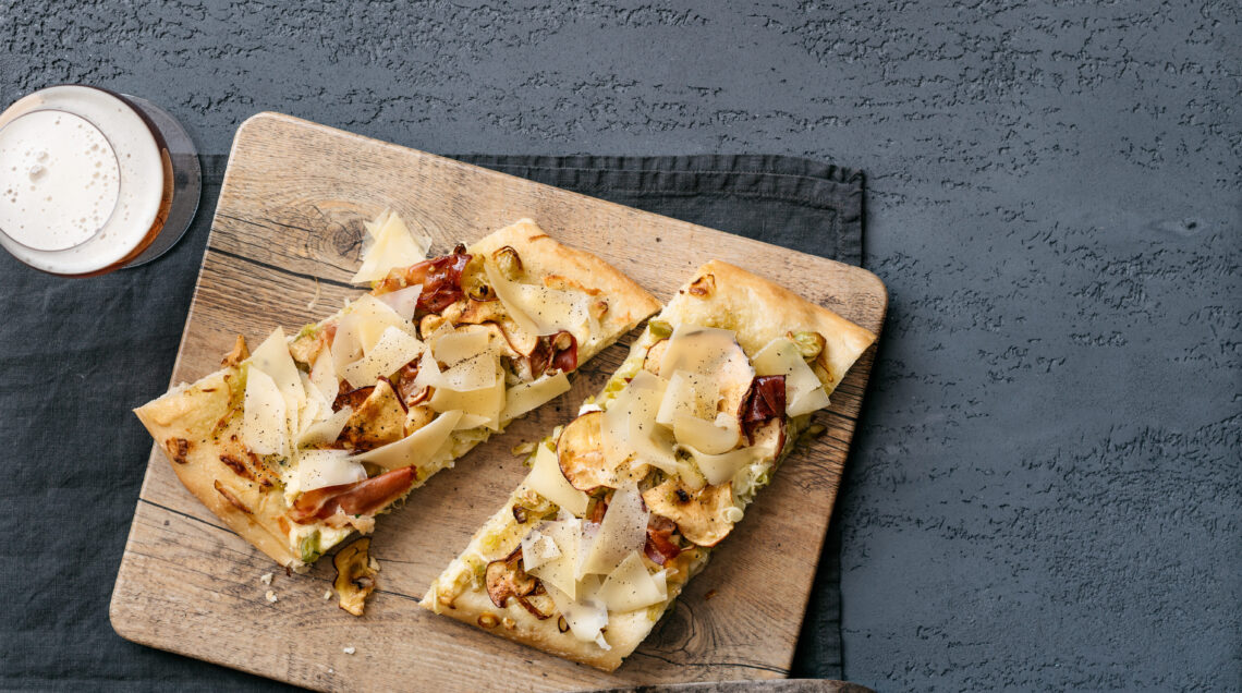 300 g di pasta da pane - 200 g di fontina - 200 g di panna acida - 1 tuorlo - 2 porri - 80 g di speck - 2 mele Evelina - 20 g di burro - sale - pepe