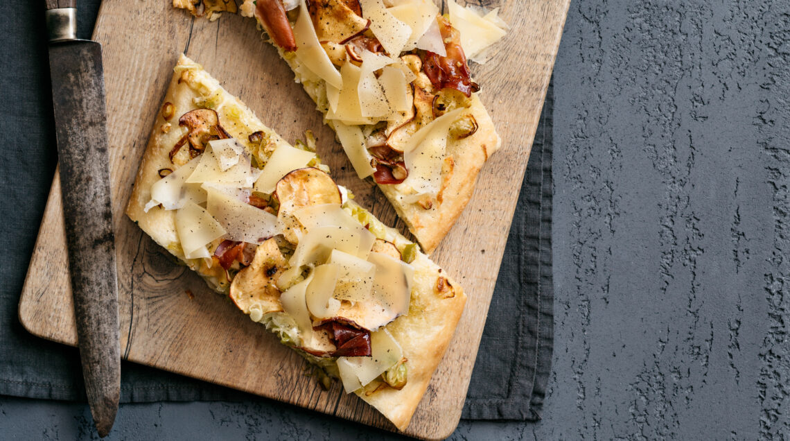 2) Stendete la pasta da pane in una sfoglia ovale dello spessore di circa 1/2 cm e trasferitela su una placca rivestita con carta da forno. Distribuitevi sopra la panna acida, i porri, i 2/3 del formaggio grattugiato grosso, lo speck tagliato a pezzetti e le mele. Regolate di sale e pepate.
