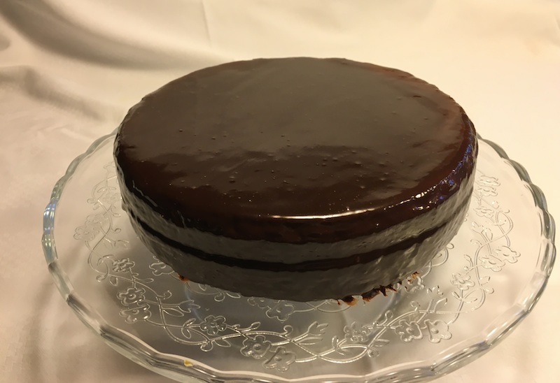 7) Togliete la torta dal frigo e riponetela su una griglia. Ricopritela con la glassa di cioccolato e livellatela con una spatola. Lasciatela riposare almeno un'ora in un luogo fresco (non in frigo) prima di servire.