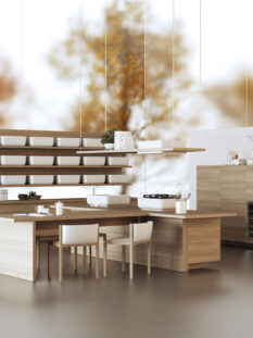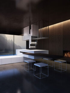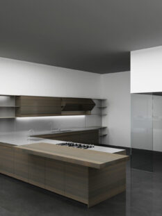 Porta la firma di Nendo – famoso studio giapponese di design guidato da Oki Sato – il progetto “KI” realizzato da Scavolini. Veri protagonisti sulla scena sono i contenitori (KI in giapponese significa proprio contenitore) che interpretano il lavello e il piano cottura e fungono da pensili appoggiati sulle lunghe mensole.