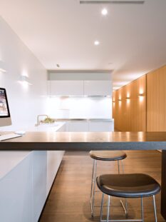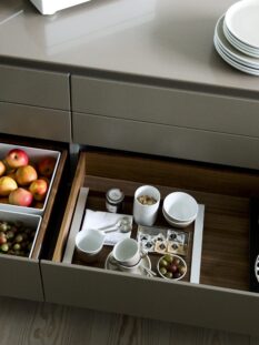 Fa da trait d’union tra la cucina e il living “b3_2” di Bulthaup, modulare e dotata di cassetti e contenitori interni adatti a ogni esigenza.
