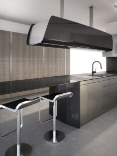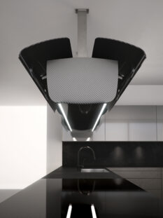 Iper-tecnologico anche il progetto di Toncelli che ci stupisce con “Invisibile”, la cucina che suona. Il nuovo sistema domotico, collegato al web, consente la diffusione della musica che dalla superficie dei mobili, attraverso degli eccitatori acustici – piccoli magneti che si applicano su qualsiasi piano - viene amplificata in tutto l’ambiente. Inoltre la penisola ha struttura in fibra di carbonio, resistente e leggera, mentre le ante delle colonne e dei pensili sono verniciate con metallo liquido.
