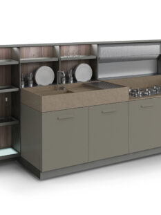 Smaterializzazione e riciclo continuano a segnare la produzione di Valcucine e del suo programma, ormai storico, “Artematica”: base in vetro completamente riciclabile con fianco strutturale di soli 10 mm (normalmente lo spessore è di 36 mm). Oggi Valcucine propone Sinetempore abbinata ad Artematica Vitrum: preziosa la cura artigianale in ogni fase della produzione, dalla pirografia all’intarsio, dall’intaglio al mosaico.