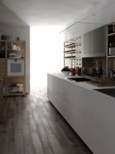 Stessa filosofia contraddistingue il progetto “Vela” di Dada: gli spessori delle ante si assottigliano riducendosi a soli 12 mm.